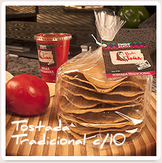 Tostada baja en grasa con 12 cm de diámetro. Puede disfrutarla sola, acompañando sus platillos o preparándolas con aguacate y cueritos, o con frijoles refritos.